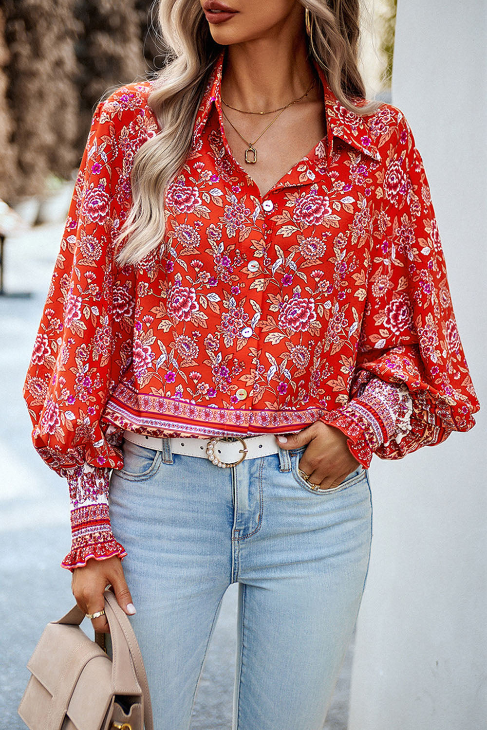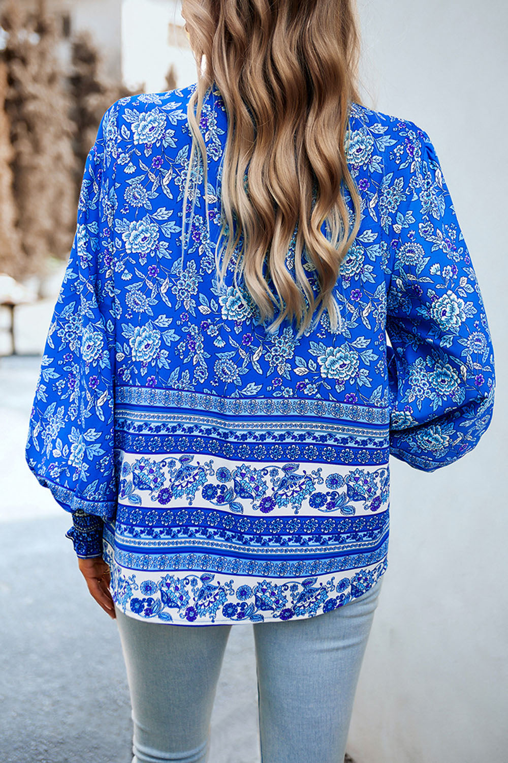 Printed Collared Neck Smocked Lantern Sleeve Shirt