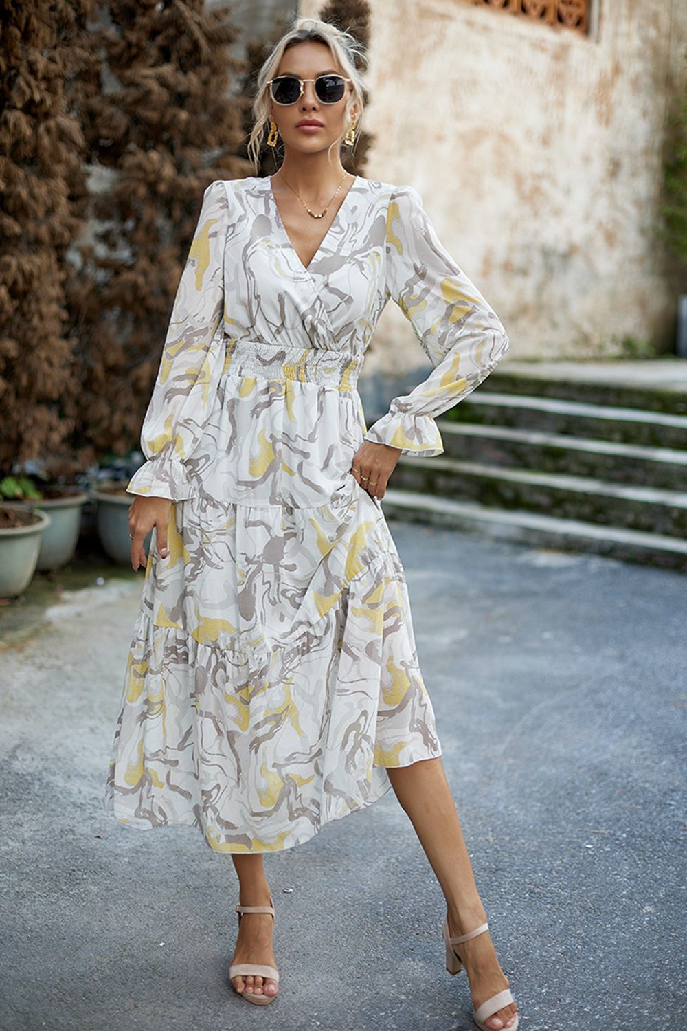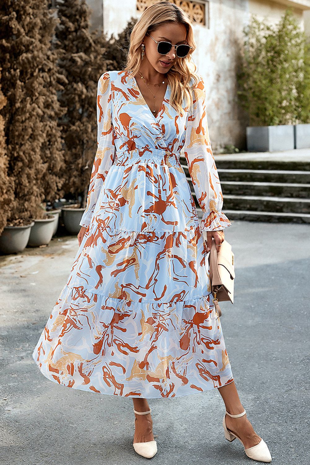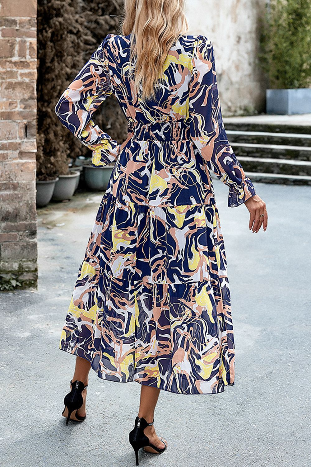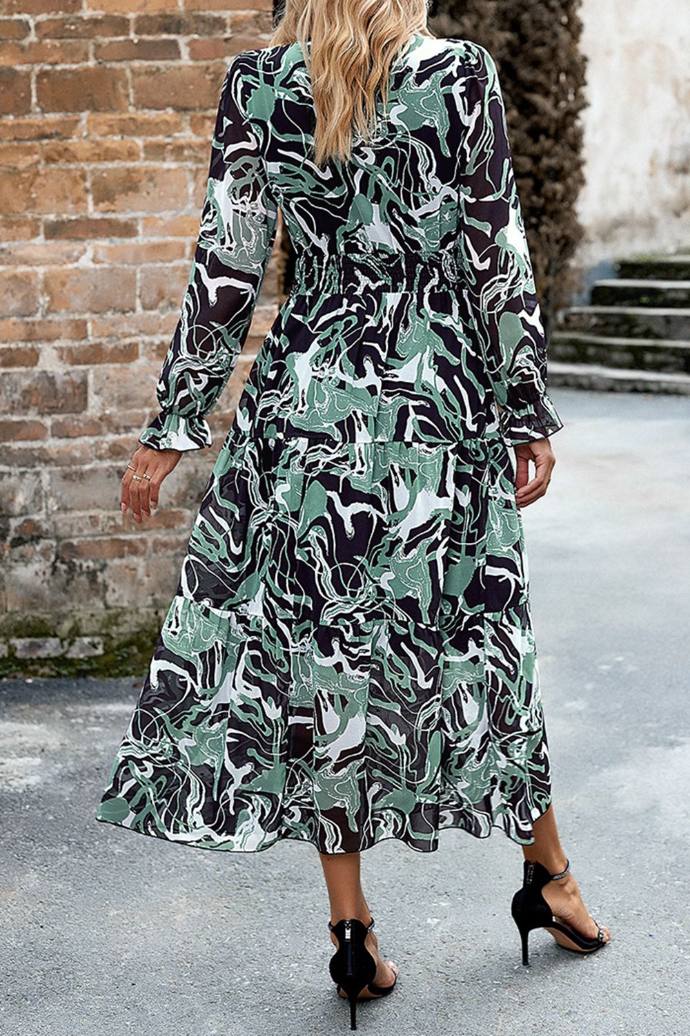 Printed Surplice Neck Flounce Sleeve Midi Dress