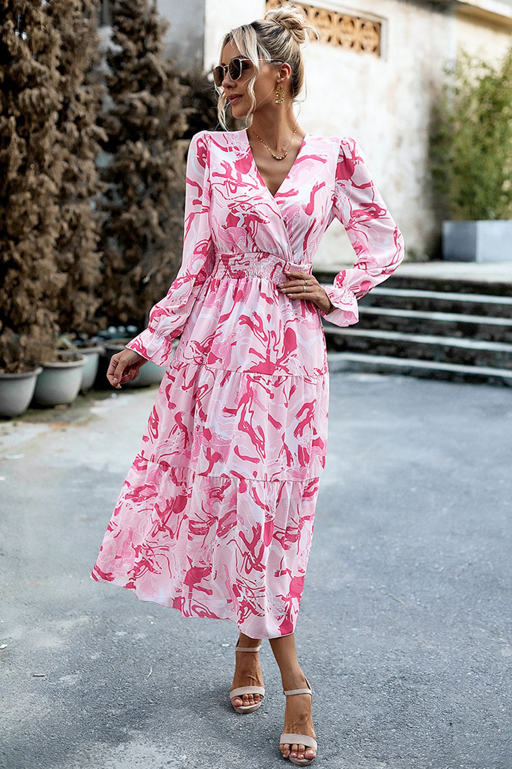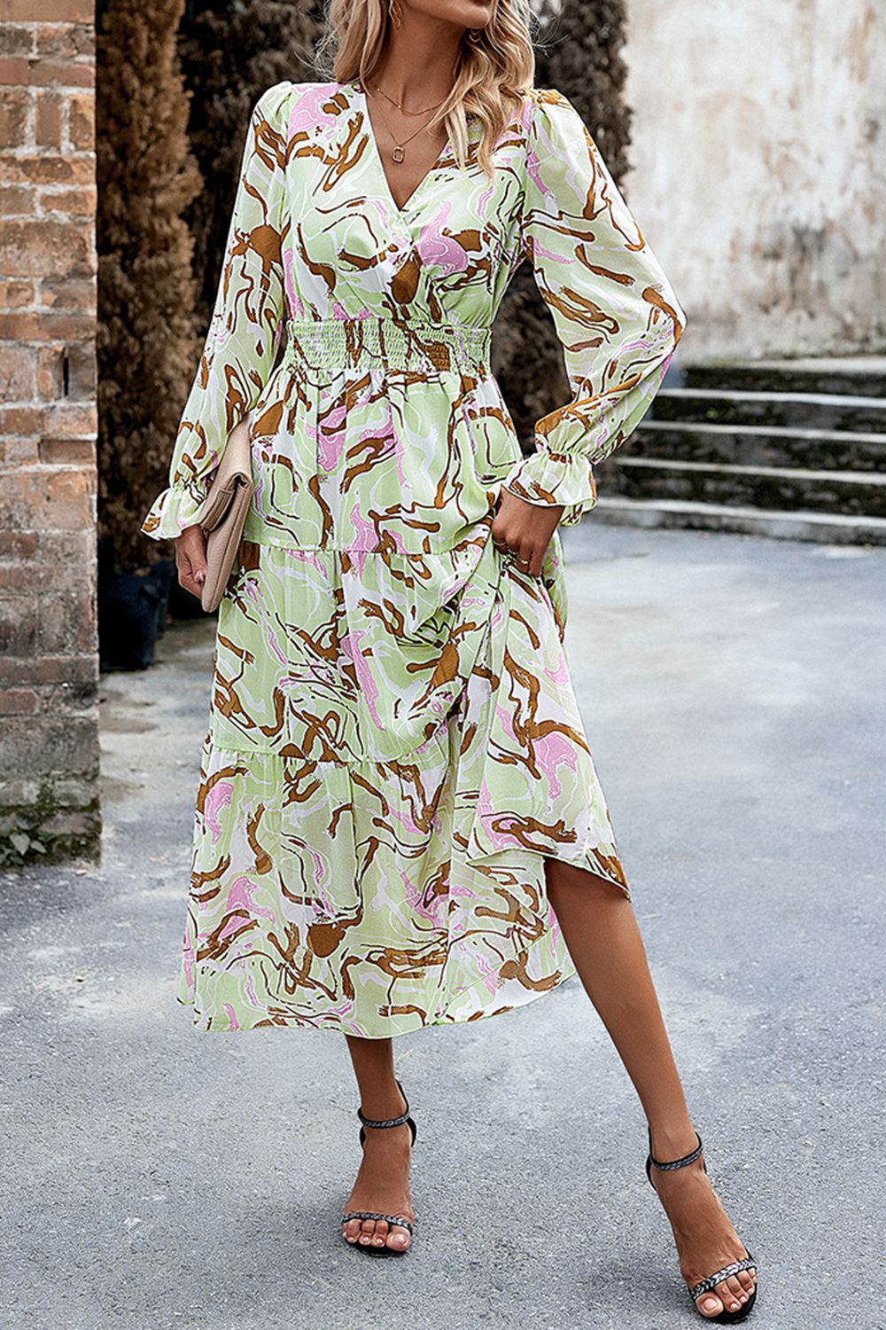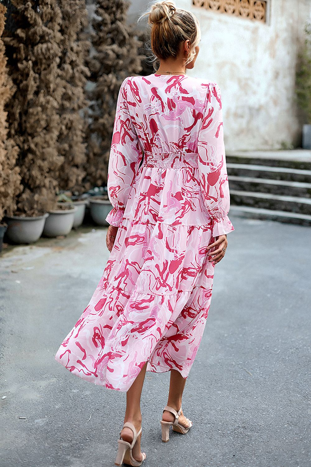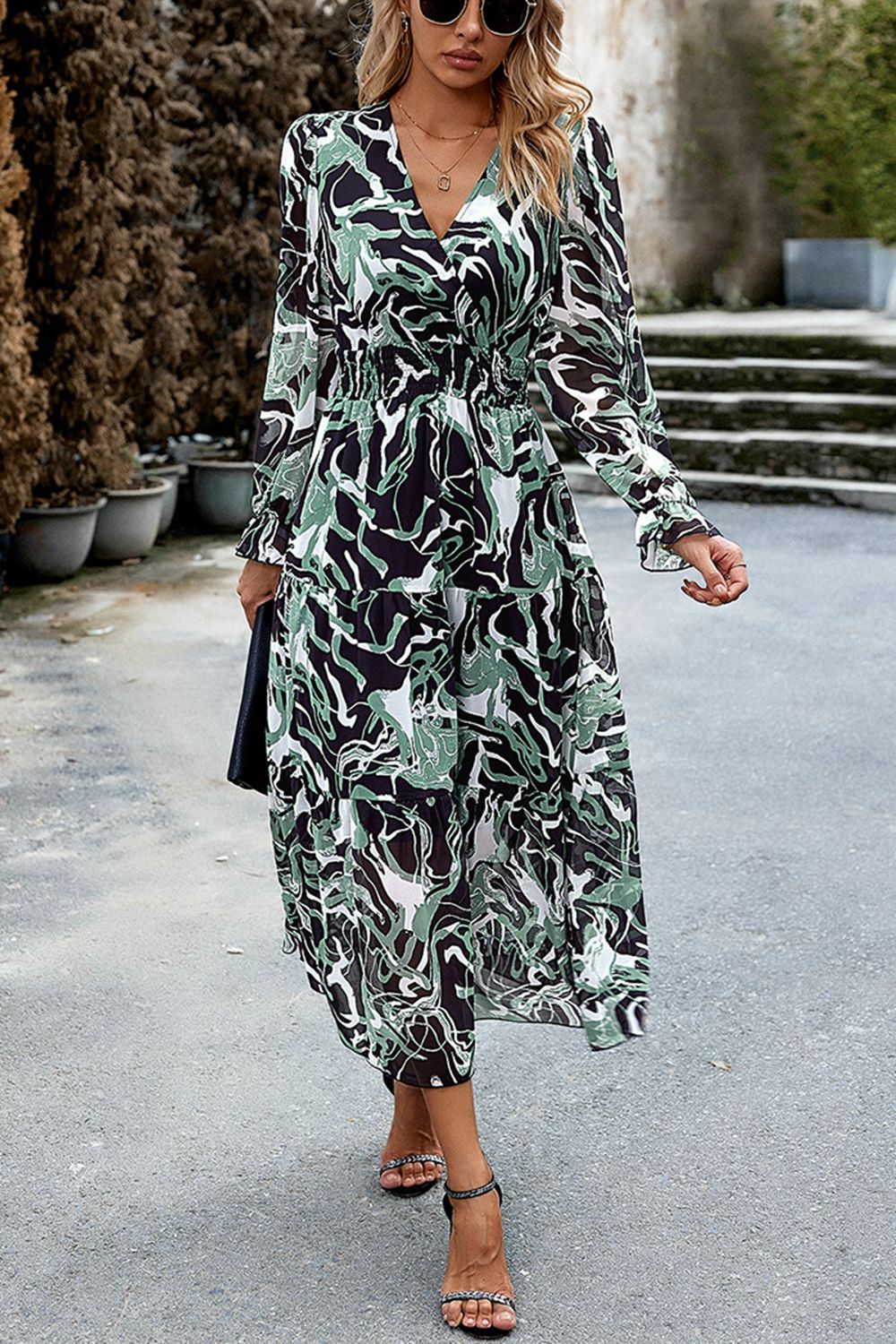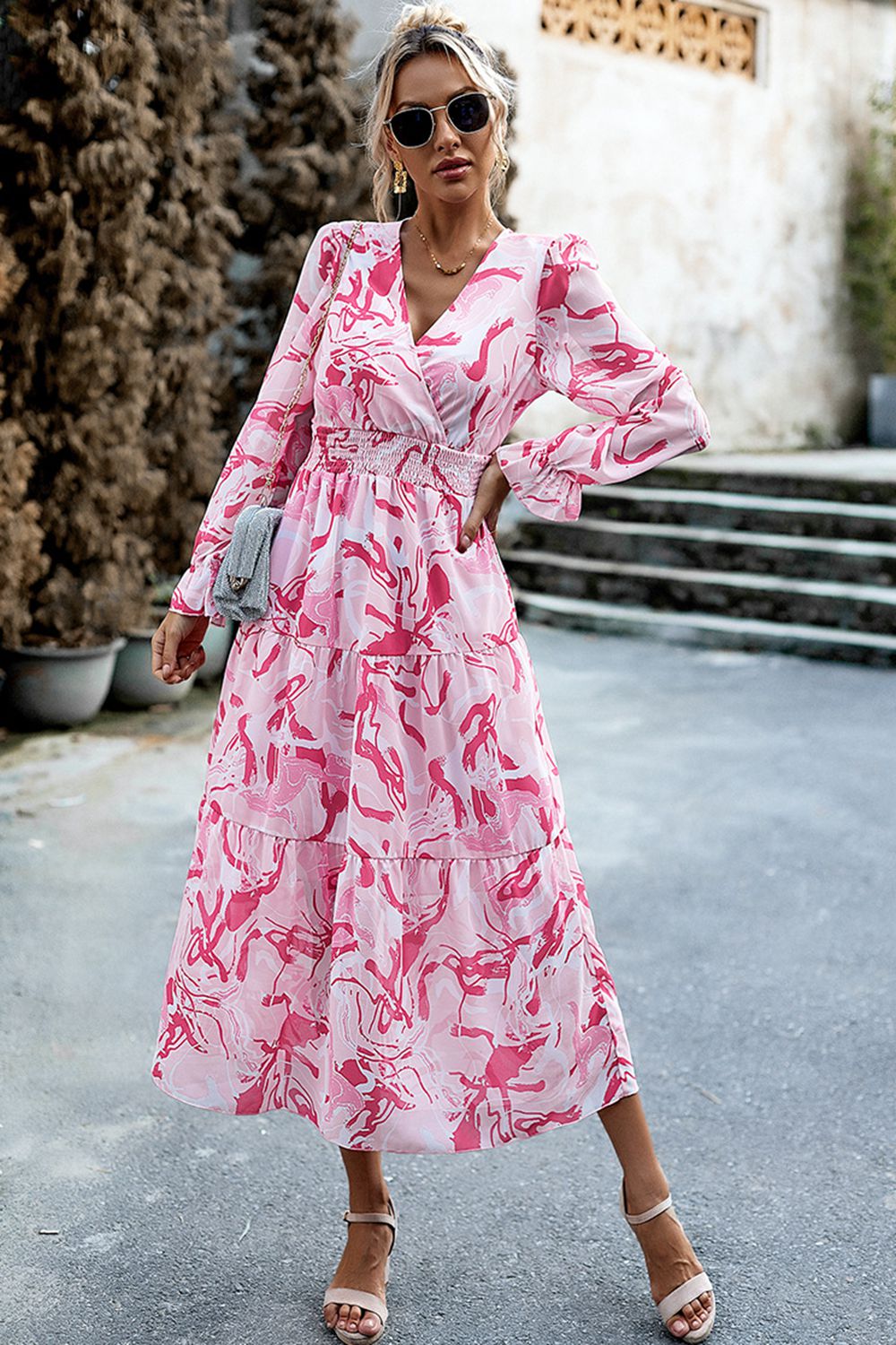 Printed Surplice Neck Flounce Sleeve Midi Dress