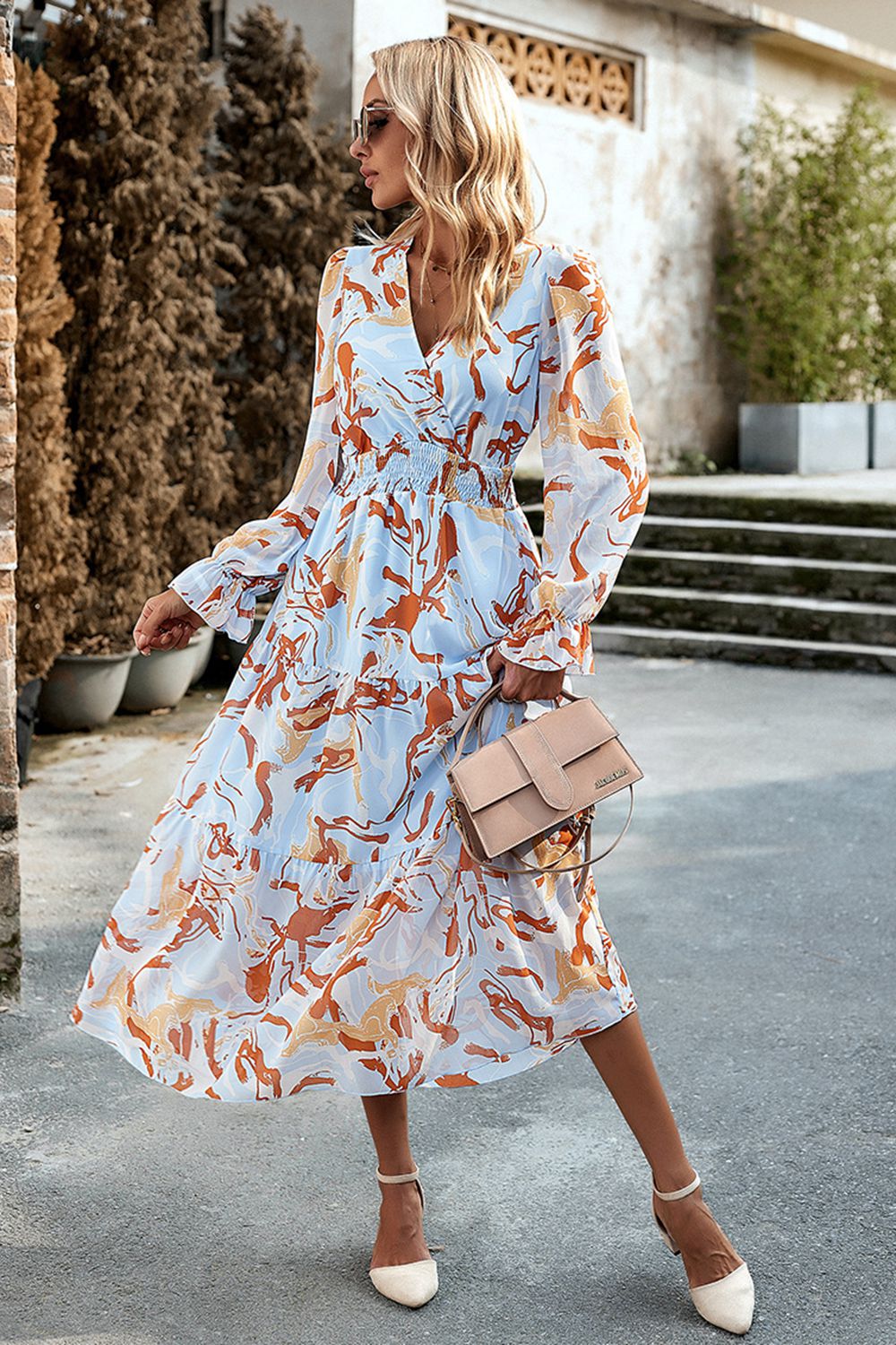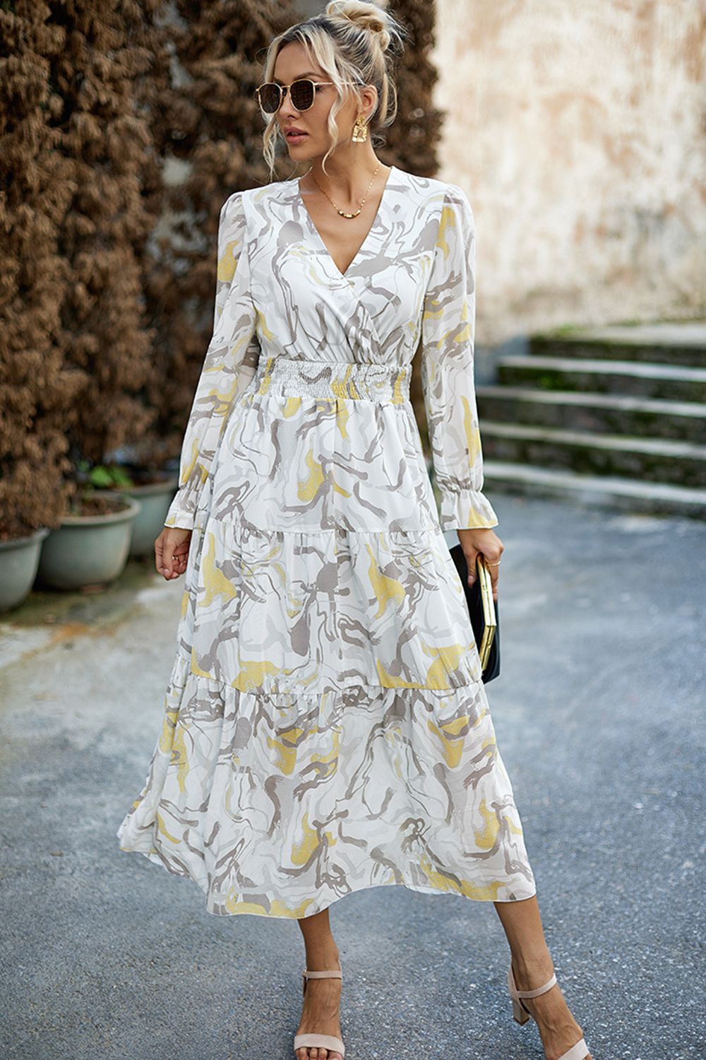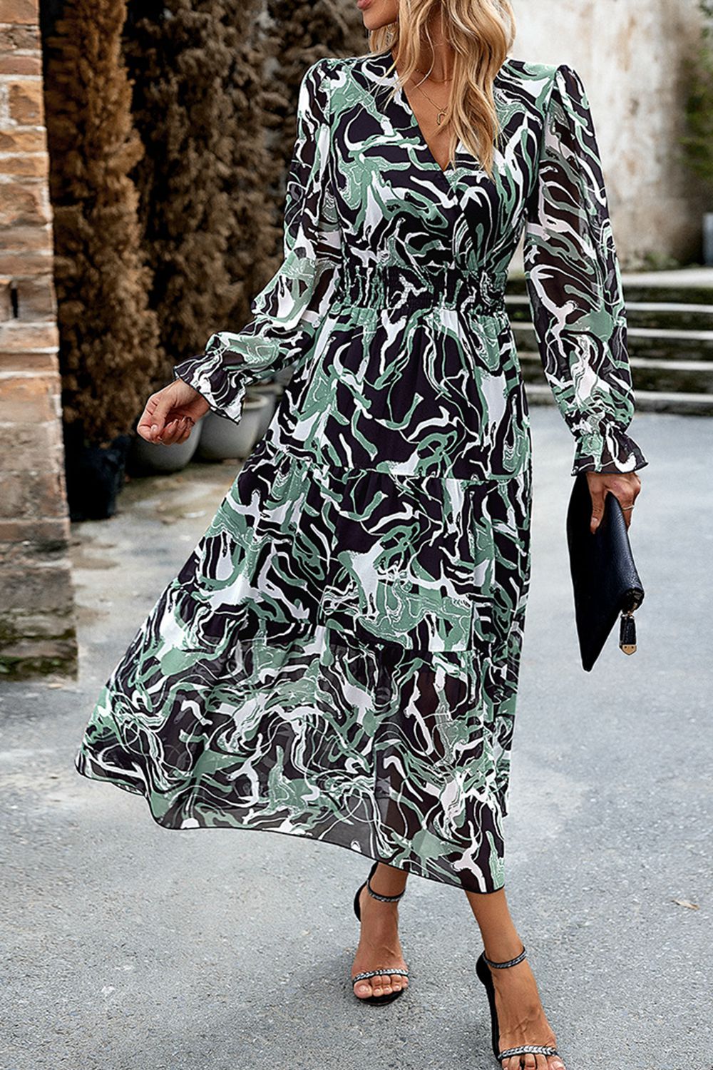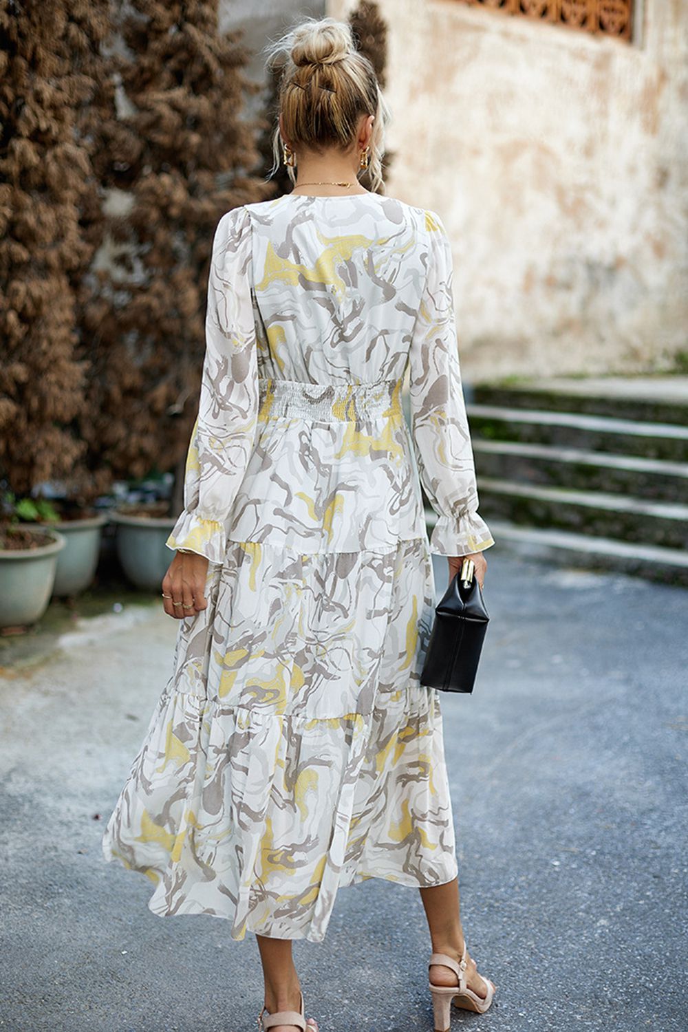 Printed Surplice Neck Flounce Sleeve Midi Dress