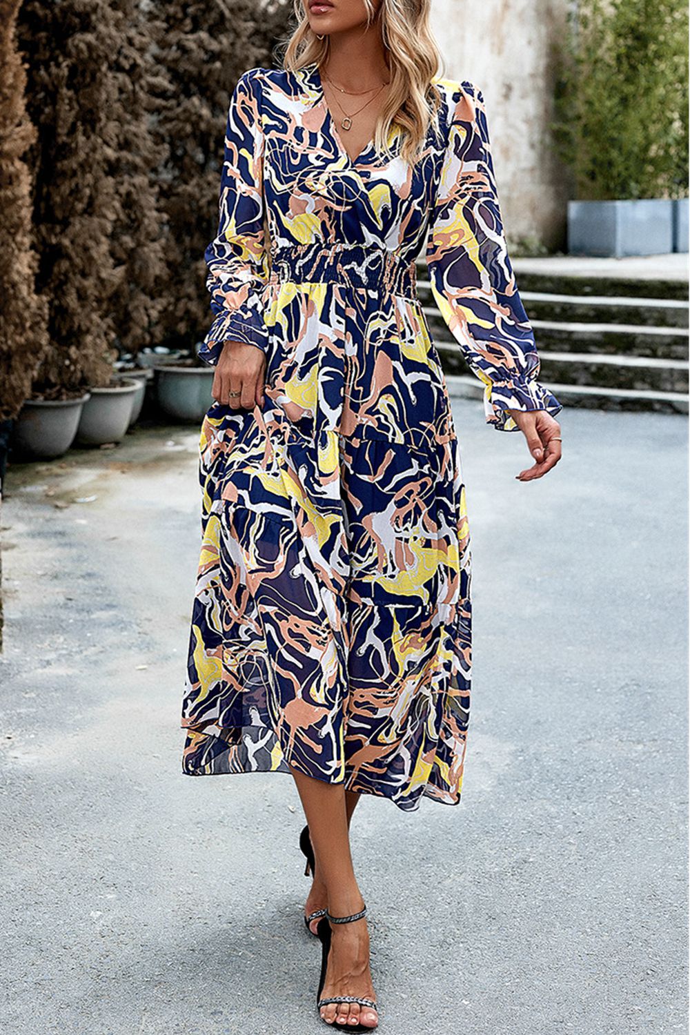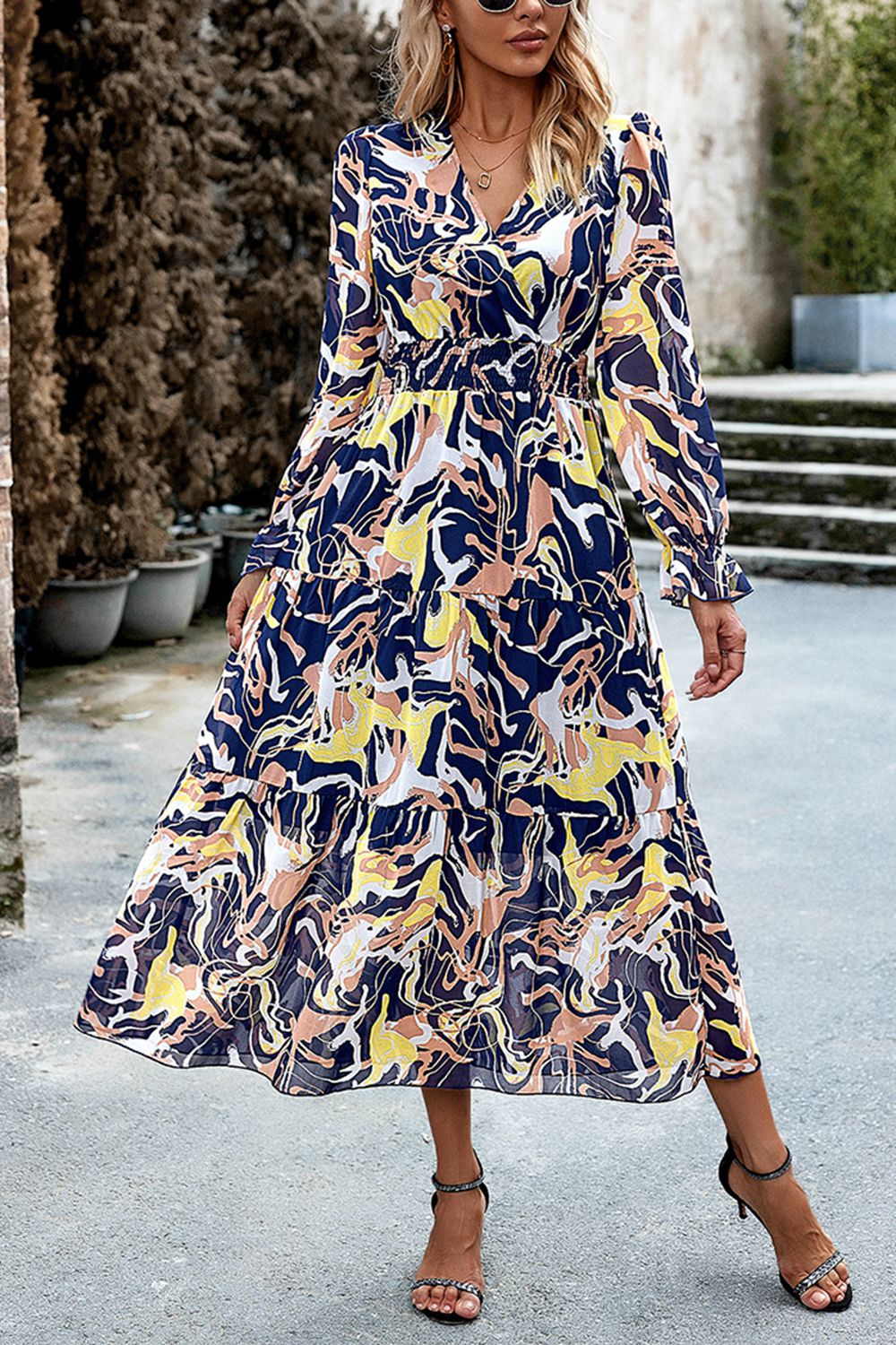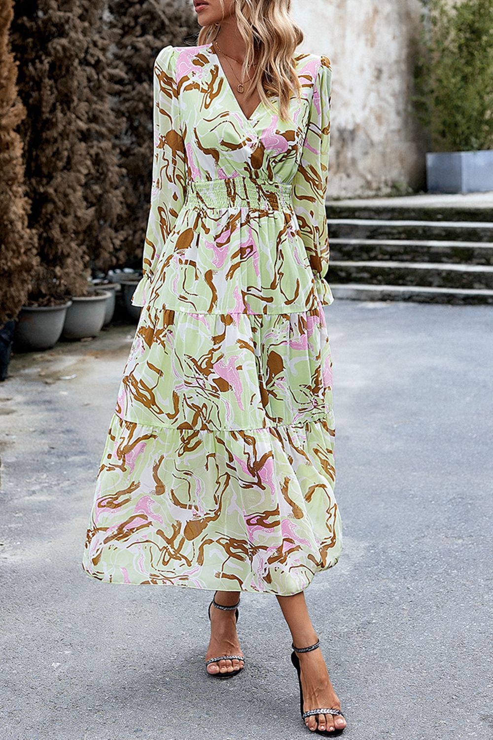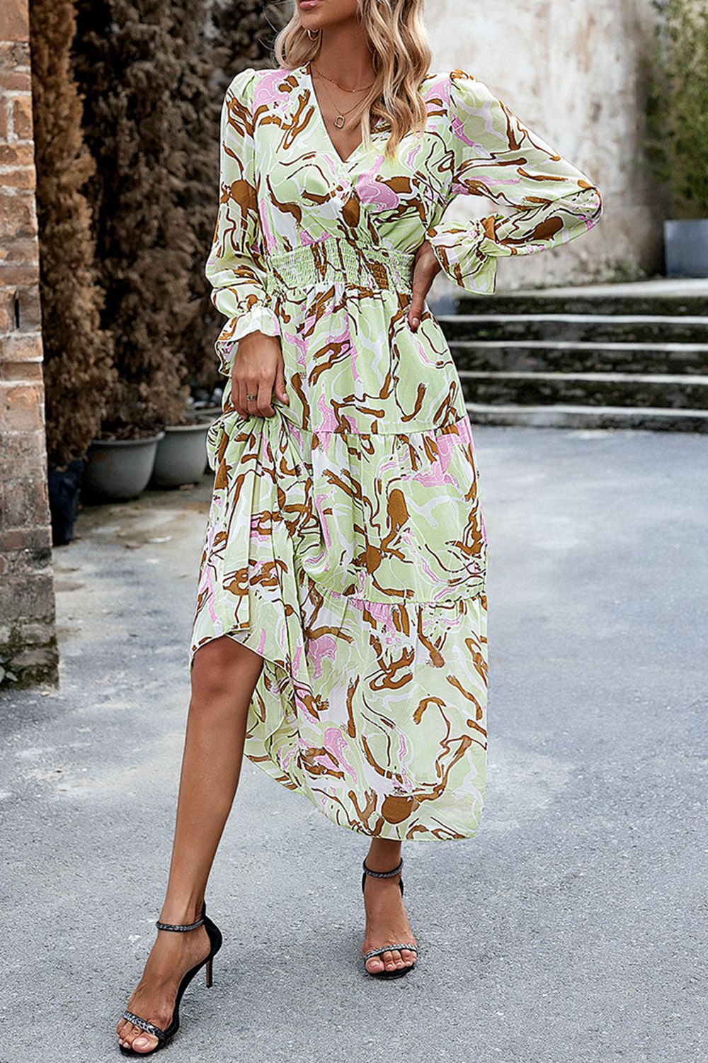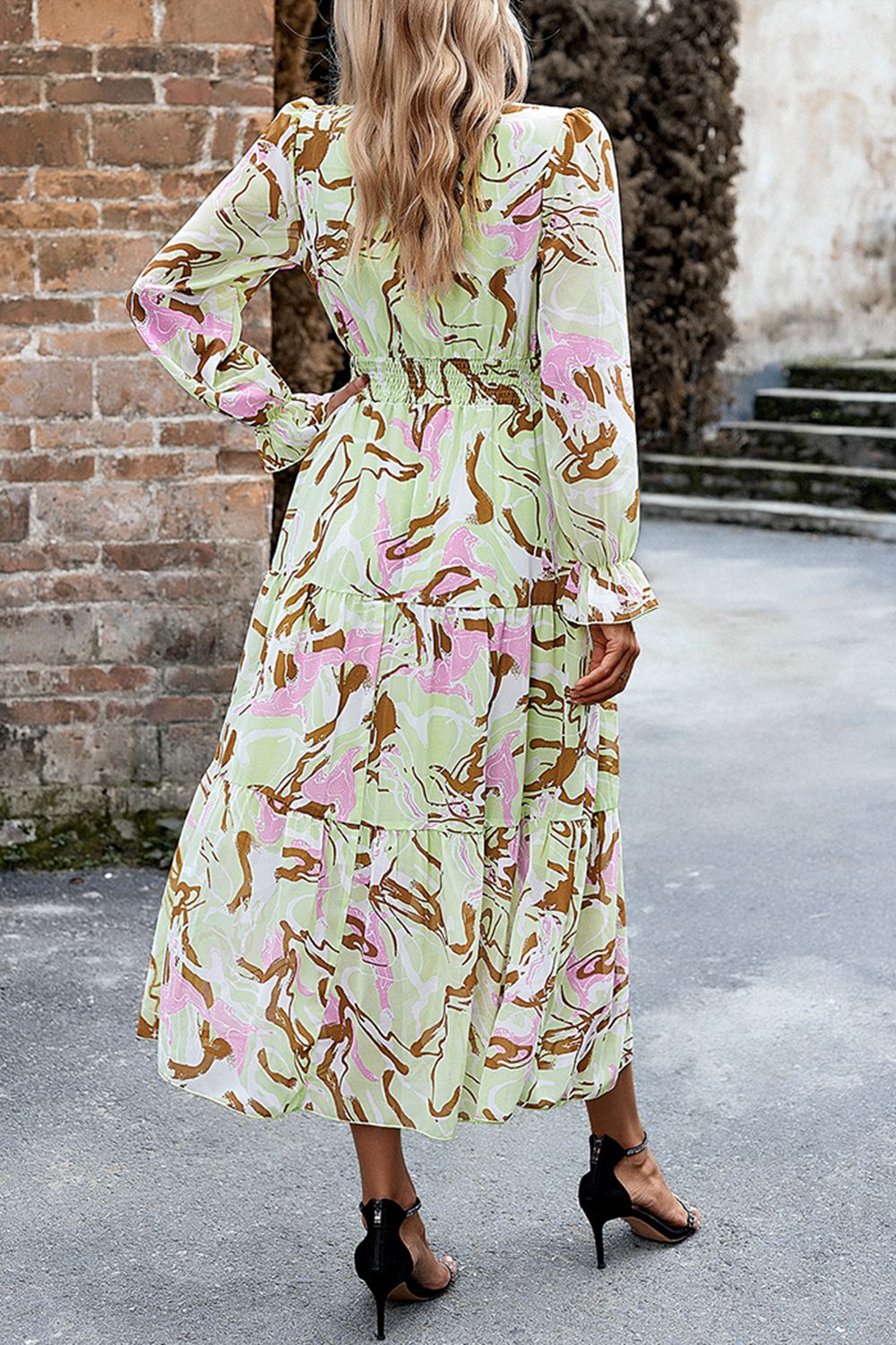 Printed Surplice Neck Flounce Sleeve Midi Dress